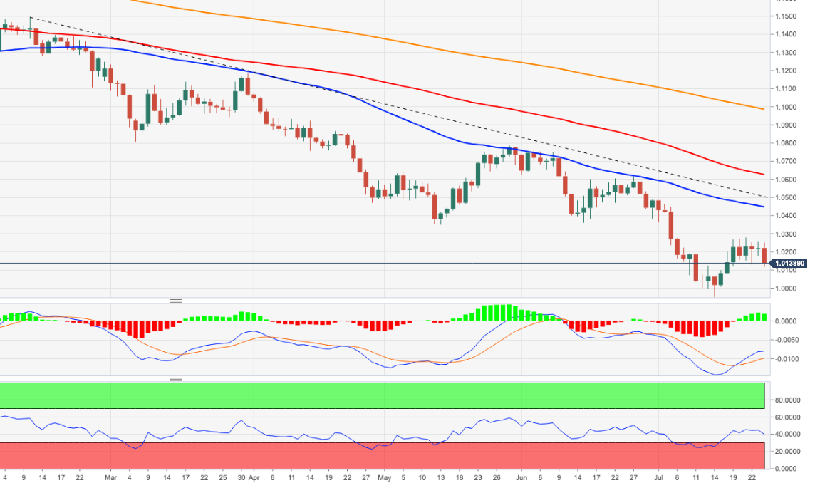 If the pair breaches the 1.0100 region, then the next support of note is seen at the parity level, which is expected to hold the downside ahead of a potential drop to the 2022 low at 0.9952 (July 14).